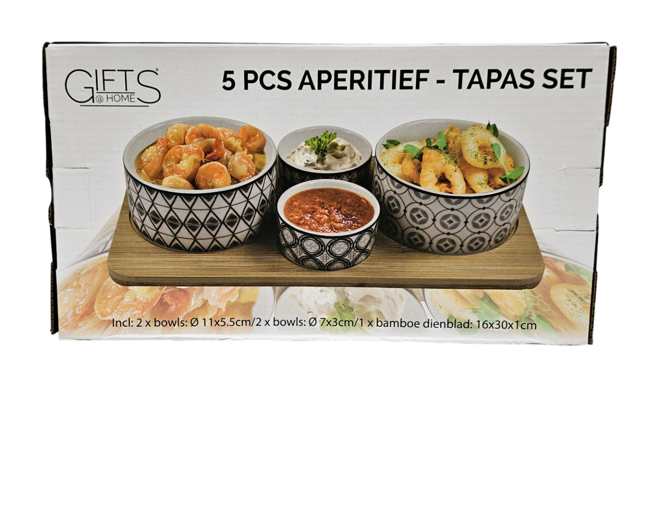 Bringe Stil und Eleganz auf deinen Tisch mit diesem 5-teiligen Aperitif- und Tapas-Set von Gifts@Home. Perfekt für gesellige Runden und kulinarische Erlebnisse!